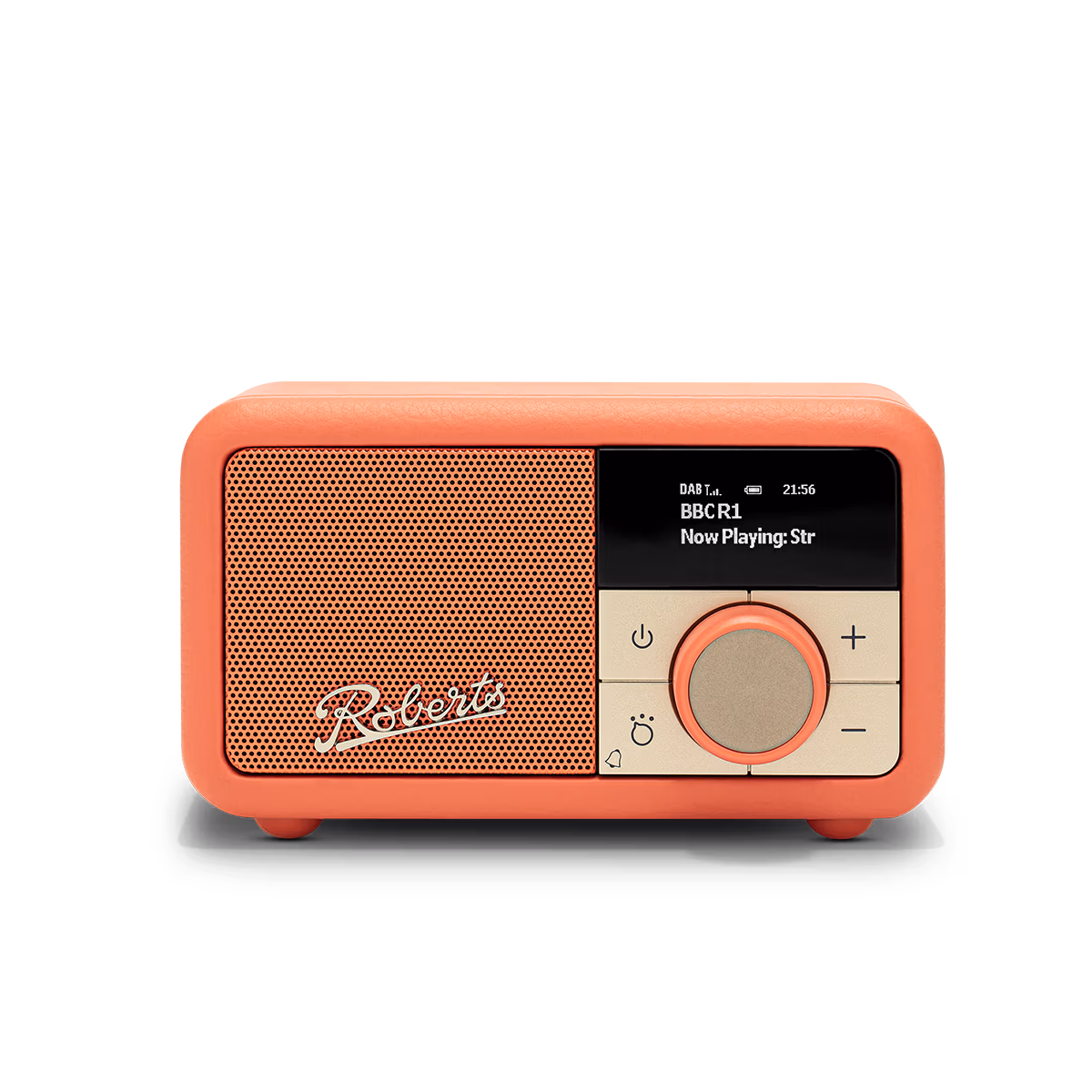 De Roberts Radio Revival Petite 2 Pop-sinaasappel is een compacte DAB+/FM-radio met Bluetooth en wekkerfunctie, uitgevoerd in het iconische Revival retrodesign van Roberts
