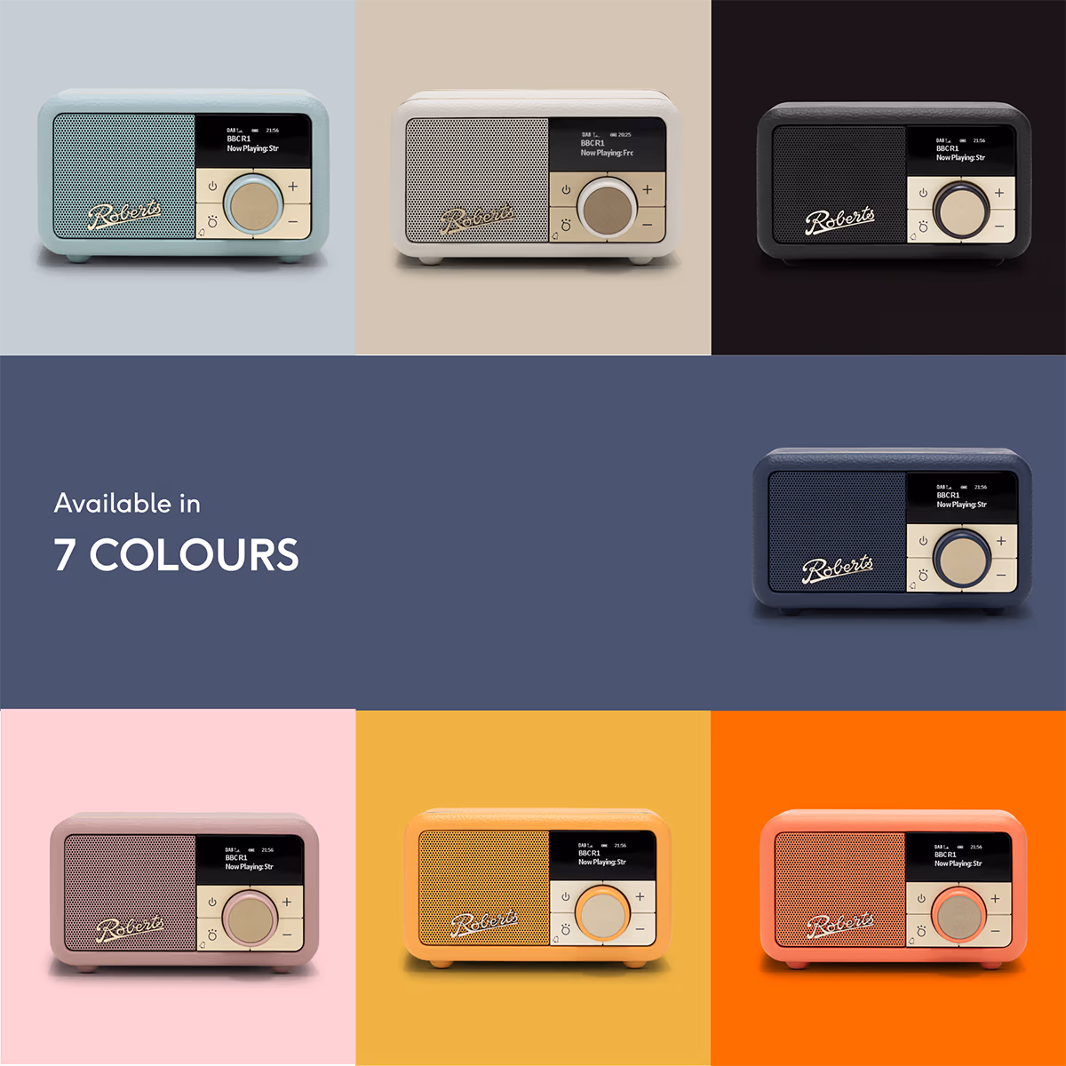 De Roberts Radio Revival Petite 2 Donkerroze is verkrijgbaar in de volgende kleuren: Middernachtblauw, Donkerroze, Eendenei, Pastelcrème, Zwart, Pop-sinaasappel, Zonnestraalgeel, Grijs, en Dieprood.